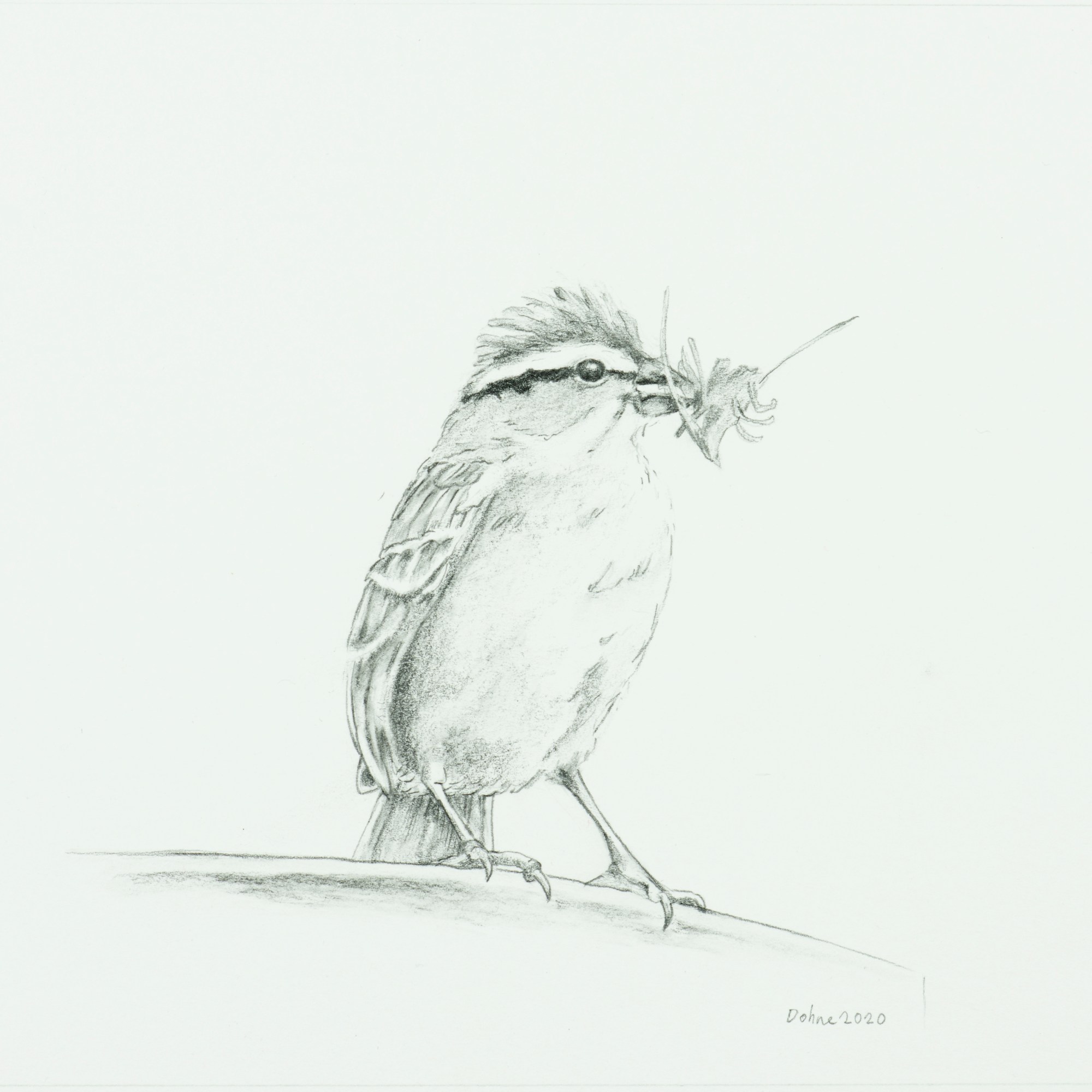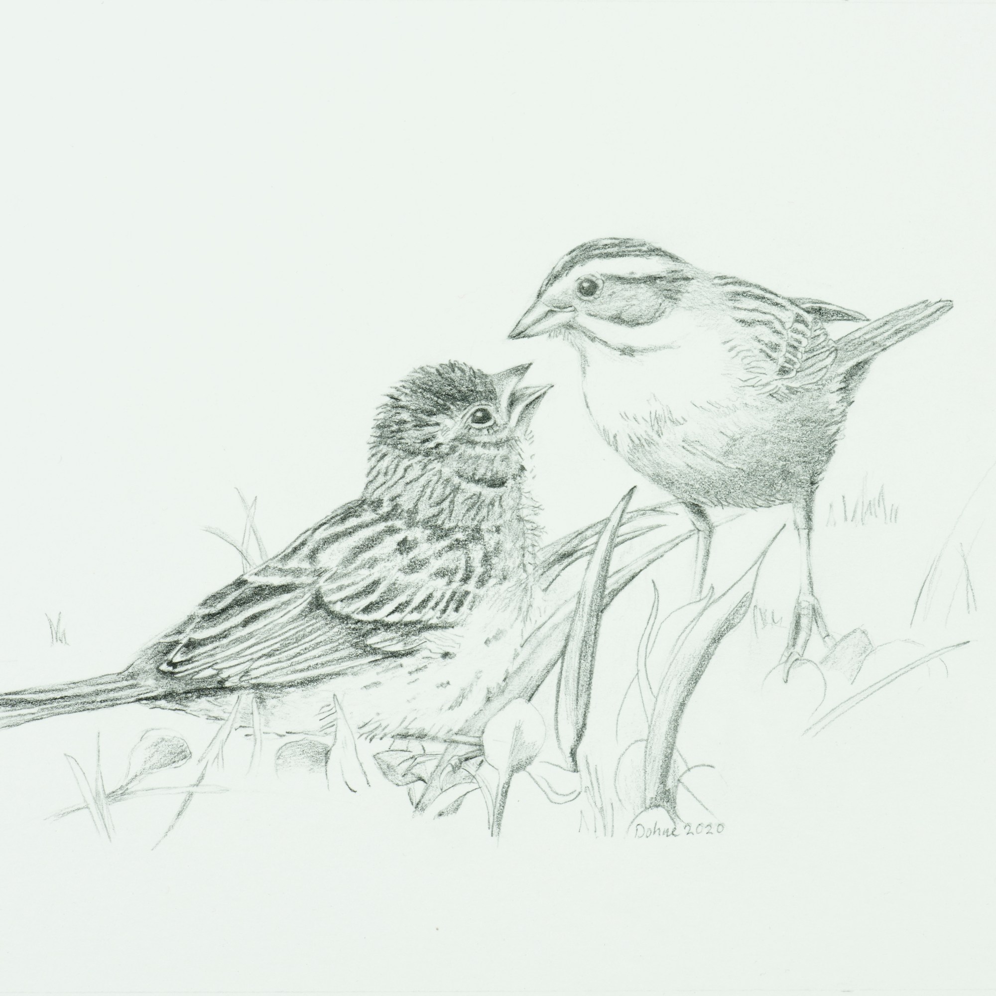 Featuring drawings of Male Clay-colored Sparrow singing from his favorite perch, Male Clay-colored Sparrow feeding ten-day old offspring, and Chipping Sparrow helper with food showing typical raised crown seen before each attempt to get to nest