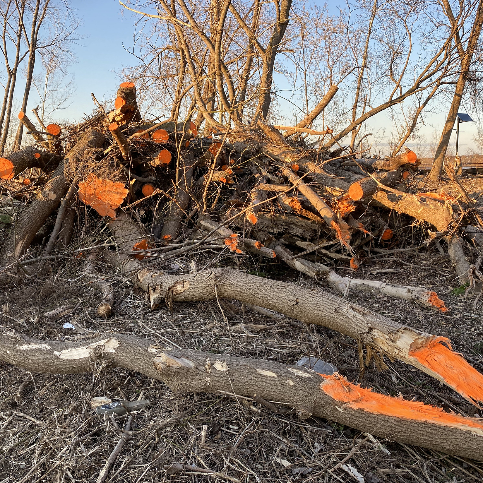 This is an overt and anonymous intervention addressing deforestation at Onondaga Lake. Painting all the crosscut log ends fluorescent orange called attention to the clear-cutting of Wood Thrush habitat and Onondaga Lake breeding grounds. The Wood Thrush is in steep decline due to loss of forest needed for successful breeding. Interventions, conservation, and activism, while invisible in a portfolio, are essential to my practice. Other examples feature citizen science data contributions, volunteer work, site stewardship, and speaking at DEC hearings.