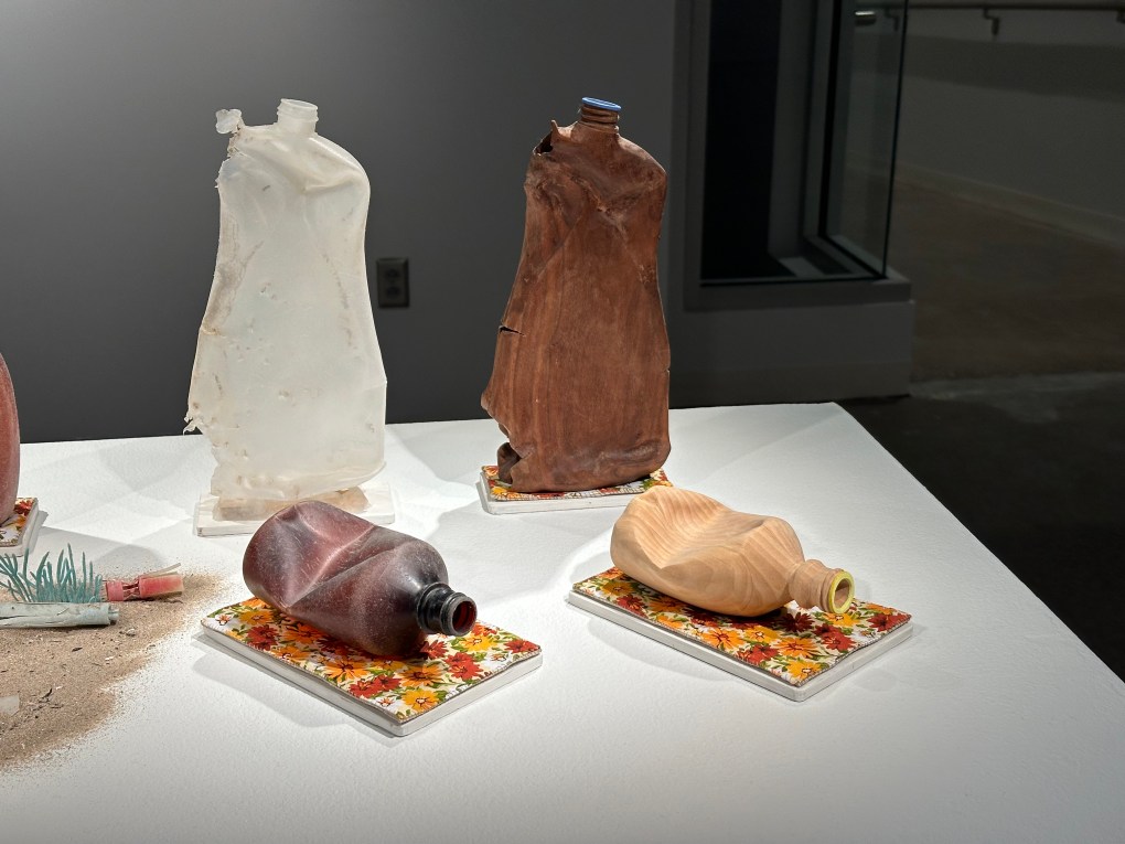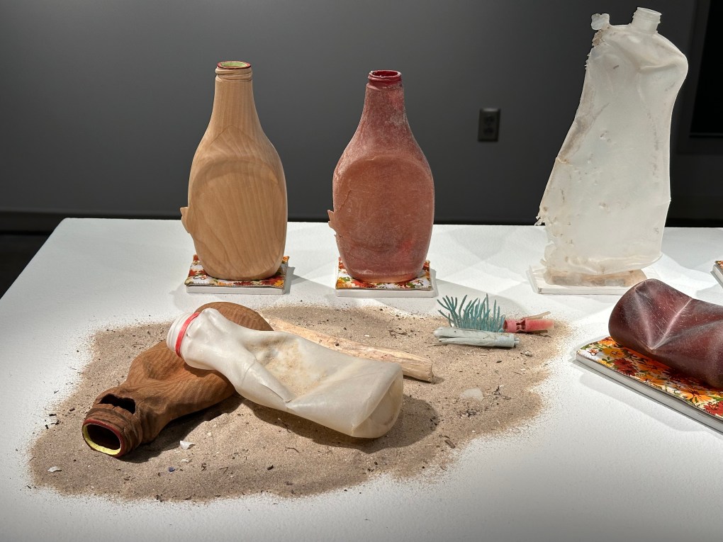 Collected and recycled beach plastic, replaced at the original site with replicas hand-carved in wood. These wood bottles eventually begin to decay, transforming into floating mini habitats. As the biodegradable wood naturally decomposes, it hosts algae and insect communities, a healthy part of the food web. An earth friendly alternative to plastic bottles that break down into micro plastic particles. This environmental intervention comments on sustainable alternatives and consumption, fossil fuel, and climate change.